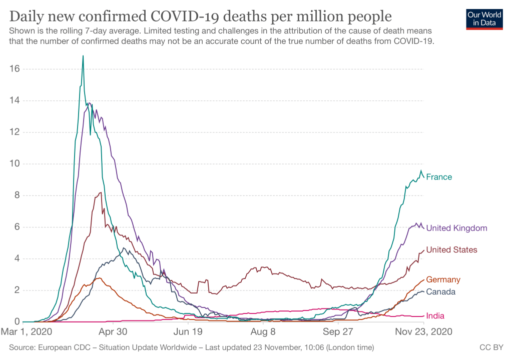 Deaths increased in October/November less dramatically than cases, reflecting large improvements in treatment of serious Covid. Deaths lag cases by approximately 2 weeks, which may explain why France’s recent turnaround in infection rates does not show up yet.